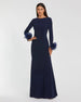 This long sleeve fitted gown features a boat neckline and elegant 3D flower accents, creating a stunning and sophisticated look. Crafted from soft jersey fabric, it offers both comfort and style.